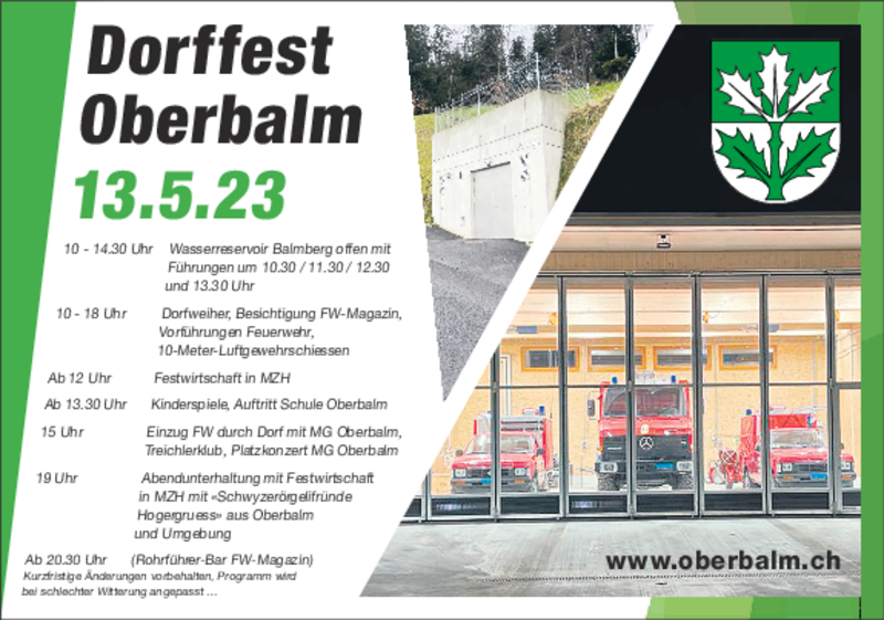 Zusammen mit den Oberbalmer Vereinen freuen wir uns, das Feuerwehr Magazin, das Wasserreservoir und die Dorfzone zusammen mit euch einzuweihen.